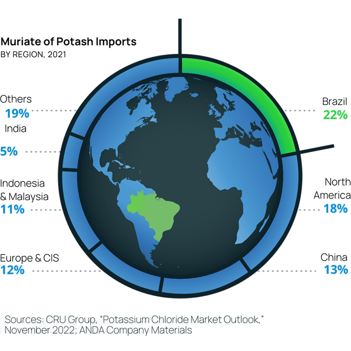 O Brasil é o segundo maior consumidor de potássio do mundo, mas depende de importações para mais de 95% do seu abastecimento - o que o torna o maior importador de fertilizantes do mundo. Com uma produção interna mínima, o país depende de fontes distantes como a Rússia e a Bielorrússia, ambas enfrentando instabilidade geopolítica e comercial. Como o único grande produtor local, a Potássio do Brasil oferece uma vantagem estratégica, operando a poucos quilômetros dos usuários finais, em comparação com os fornecedores atuais localizados a 12.000 a 20.000 km de distância.